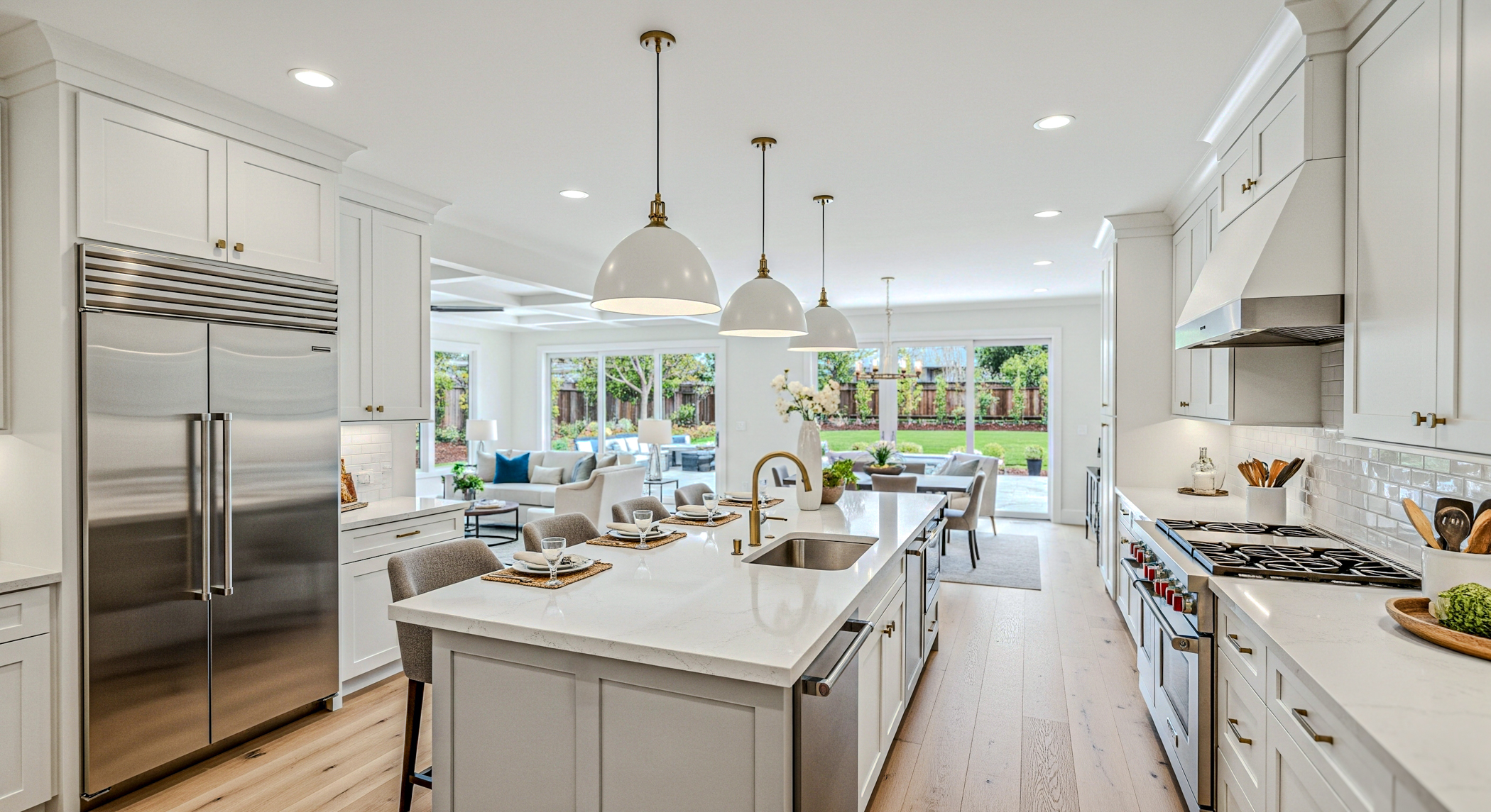 Premium materials, statement lighting, professional-style appliances, and architectural detailing for a showpiece kitchen that performs daily.